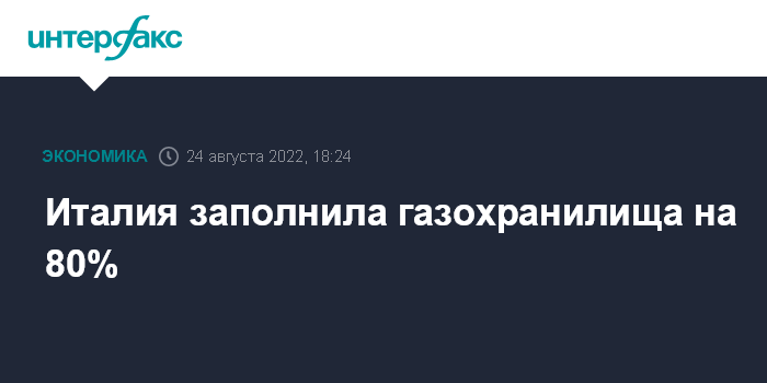 Москва. 24 августа. INTERFAX.RU - Италия к зимнему сезону заполнила газохранилища на 80%, к октябрю этот уровень должен достичь 90%, заявил в Римини премьер-министр Марио Драги. Об этом сообщает АР.
