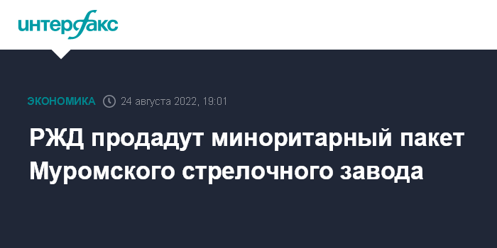 Москва. 24 августа. INTERFAX.RU - АО "РЖД управление активами" (дочернее общество ОАО "РЖД") выставило на продажу 13,33%-ный пакет голосующих акций АО "Муромский стрелочный завод" по стартовой цене 418 млн рублей, сообщили пресс-службе РЖД.