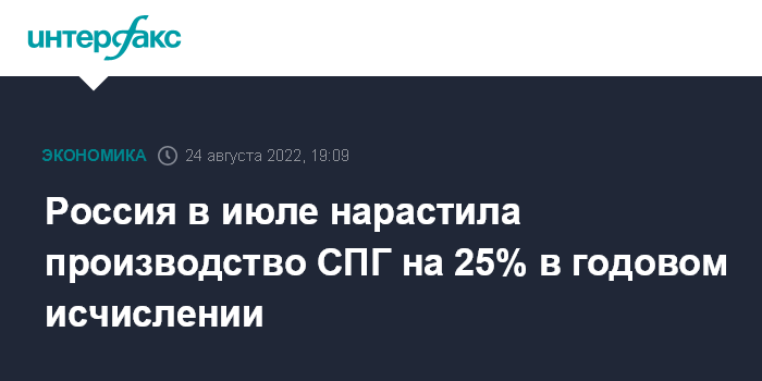Москва. 24 августа. INTERFAX.RU - Производство сжиженного природного газа в России в июле 2022 года подскочило на четверть в годовом измерении, до 2,3 млн тонн, сообщил Росстат. К июню 2022 года производство упало на 7%.