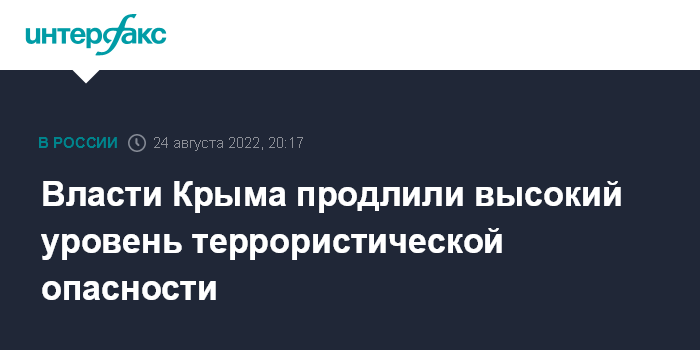 Москва. 24 августа. INTERFAX.RU - Высокий уровень террористической опасности, действующий с апреля в нескольких муниципалитетах Крыма и на ряде гособъектов, будет действовать еще минимум две недели, сообщил глава республики Сергей Аксенов.