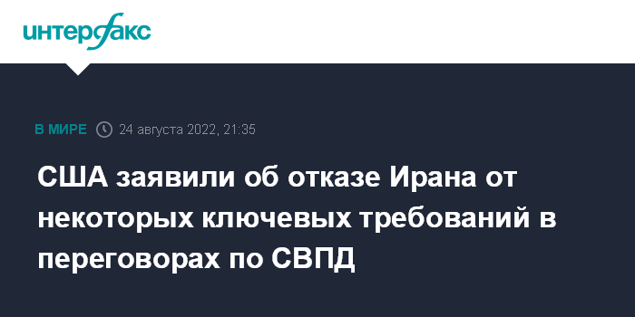 Ранее в среду сообщалось, что Иран получил ответ Соединенных Штатов на предложенный ЕС проект соглашения о восстановлении действия СВПД. Госдеп подтвердил, что США получили информацию об иранской позиции по СВПД и через ЕС направили свои комментарии по этим аспектам.
