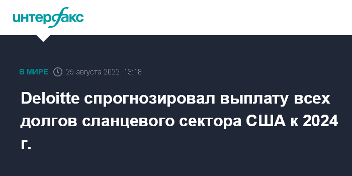 Москва. 25 августа. INTERFAX.RU - Американские производители сланцевых нефти и газа зафиксируют рекордный денежный поток – порядка $200 млрд – в 2022 году, благодаря чему отрасль сможет выплатить все долги к 2024 году и начать наращивать добычу, считают эксперты Deloitte LLP.