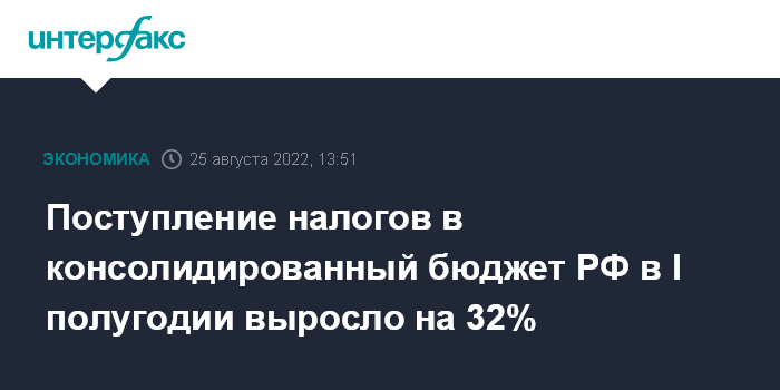 Москва. 25 августа. INTERFAX.RU - Поступление налогов в консолидированный бюджет РФ в первом полугодии 2022 года выросло на 32% к тому же периоду 2021 г., сообщил глава Федеральной налоговой службы Даниил Егоров на встрече с президентом Владимиром Путиным в четверг.