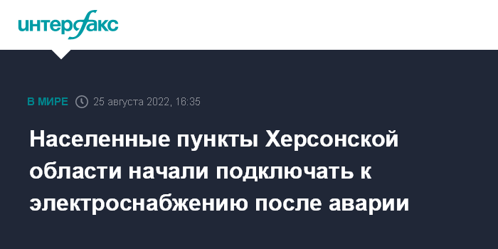 Москва. 25 августа. INTERFAX.RU - Электроснабжение, отключенное в результате аварии в Запорожской области, начали подключать в населенных пунктах Херсонской области, свет уже появился в областном центре, сообщили "Интерфаксу" во временной администрации региона.