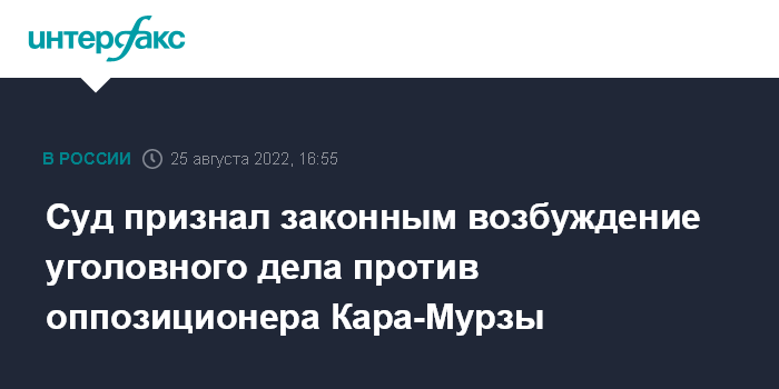 Москва. 25 августа. INTERFAX.RU - Басманный суд Москвы отказал в удовлетворении апелляционной жалобы на постановление о возбуждении уголовного дела против оппозиционера Владимира Кара-Мурзы (признан в РФ иноагентом), сообщили "Интерфаксу" в пресс-службе суда в четверг.