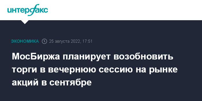 Москва. 25 августа. INTERFAX.RU - Московская биржа планирует в сентябре возобновить торги в вечернюю сессию на рынке акций, сообщил журналистам в четверг директор департамента рынка акций МосБиржи Борис Блохин.