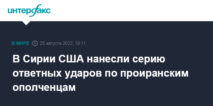 Москва. 25 августа. INTERFAX.RU - В Сирии военные США в течение последних 24 часов нанесли серию ударов по позициям проиранских военизированных формирований в провинции Дейр-эз-Зор в ответ на ракетные обстрелы американских баз, сообщает EFE.
