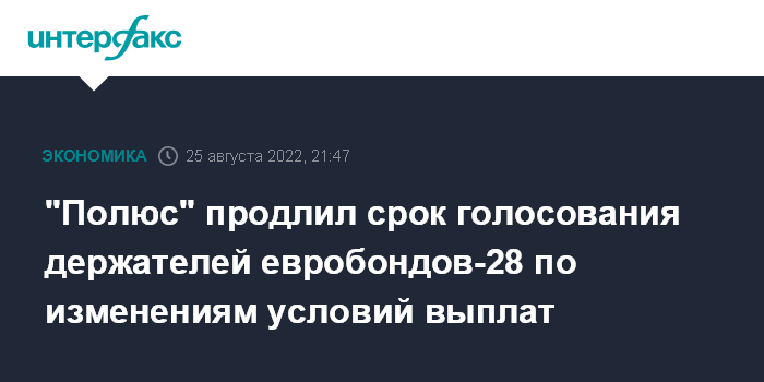 Москва. 25 августа. INTERFAX.RU - Золотодобывающая компания "Полюс" вновь продлила срок предоставления держателями еврооблигаций компании с погашением в 2028 году согласия на изменение условий выпуска, включающих возможность выплат в рублях и продление льготного периода проведения платежей.