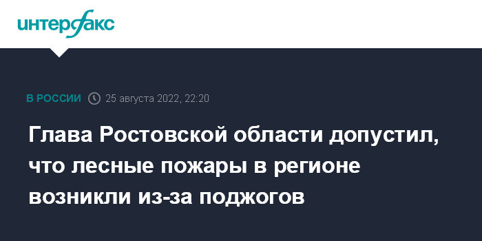 Москва. 25 августа. INTERFAX.RU - Губернатор Ростовской области Василий Голубев не исключает человеческий фактор в качестве возможной причины пожаров на территории региона.