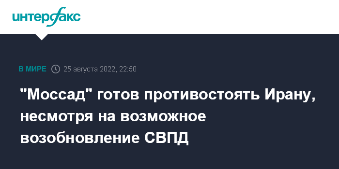 Москва. 25 августа. INTERFAX.RU - Израильская разведслужба "Моссад" готова при необходимости проводить операции против Ирана во имя защиты интересов страны несмотря на то, что западные страны могут вскоре договориться с Тегераном о возобновлении Совместного всеобъемлющего плана действий (СВПД) по иранской ядерной программе, цитирует газета The Jerusalem Post директора израильской разведслужбы "Моссад" Давида Барнеа.