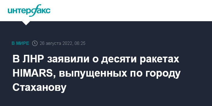 Москва. 26 августа. INTERFAX.RU - Вооруженные силы Украины обстреляли подконтрольный Луганской народной республике город Стаханов из реактивных систем залпового огня HIMARS американского производства, сообщает представительство ЛНР в Совместном центре по контролю и координации режима прекращения огня (СЦКК).
