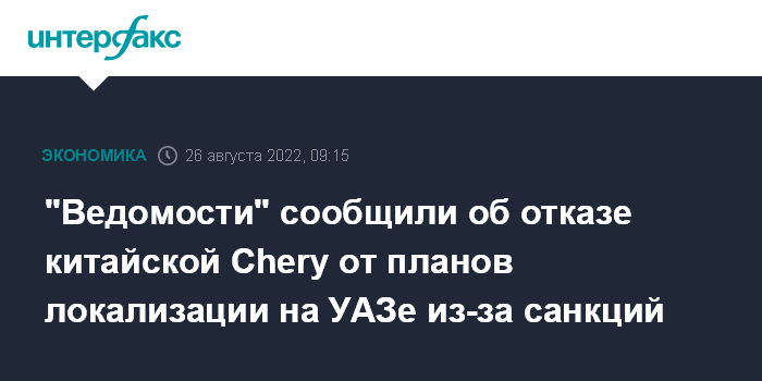 Москва. 26 августа. INTERFAX.RU - Китайский автоконцерн Chery, переговоры о партнерстве с которым вела группа "Соллерс Авто", из-за санкционных рисков решил отказаться от планов локализации на основном предприятии группы - "Ульяновском автозаводе" (УАЗ), пишут "Ведомости" со ссылкой на два источника, знакомых с планами компаний.