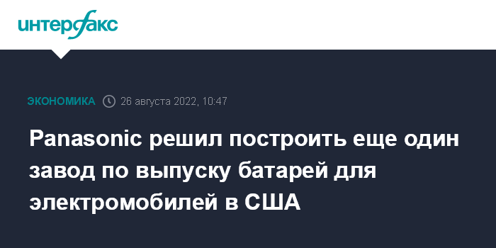 Москва. 26 августа. INTERFAX.RU - Японская Panasonic Energy Co. планирует построить еще один завод по выпуску аккумуляторов в США на фоне растущего спроса электромобили, сообщает The Wall Street Journal со ссылкой на информированные источники.
