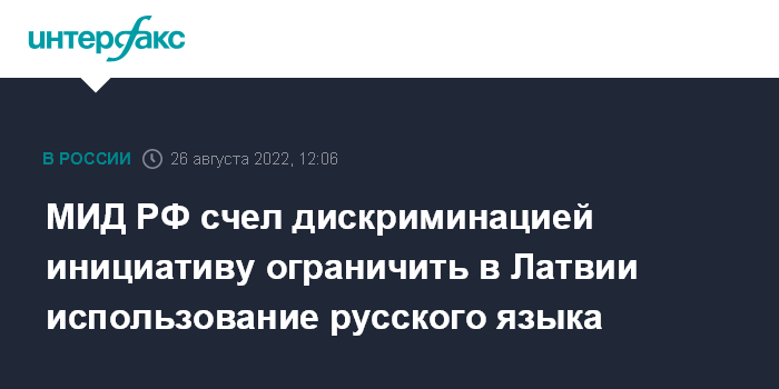 Москва. 26 августа. INTERFAX.RU - В Москве считают дискриминационной инициативу Латвии об ограничении использования русского языка, заявили в МИД РФ.