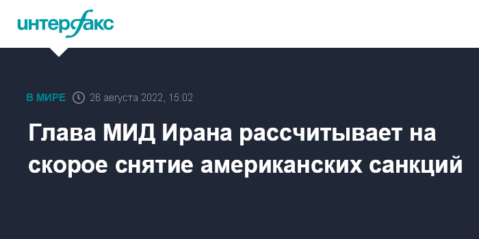 Москва. 26 августа. INTERFAX.RU - Глава иранского внешнеполитического ведомства Амир Абдоллахиян высказал надежду на то, что вопрос со снятием антииранских санкций вот-вот решится.