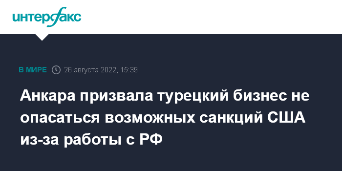Москва. 26 августа. INTERFAX.RU - Глава турецкого Минфина Нуреддин Небати в пятницу выразил мнение, что коммерческому сектору Турции не стоит опасаться возможных санкций США из-за его работы с российскими компаниями и физлицами, против которых Штаты ввели ограничительные меры.