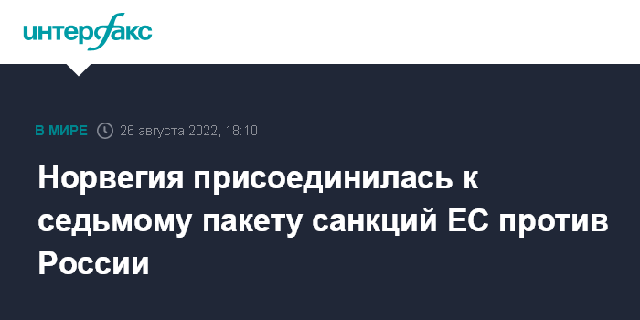 Москва. 26 августа. INTERFAX.RU - Норвегия присоединилась к седьмому пакету санкций Евросоюза против России, который Брюссель ввел 21 июля 2022 года. Об этом говорится в заявлении норвежского МИД, распространенном в пятницу.