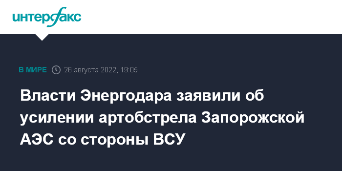 Москва. 26 августа. INTERFAX.RU - Вооруженные силы Украины усиливают артиллерийские обстрелы Запорожской АЭС в Энергодаре на подконтрольной РФ части Запорожской области, сообщили в городской администрации.