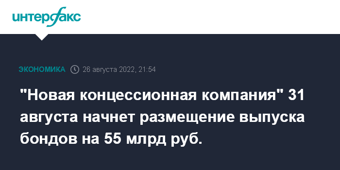 "Новая концессионная компания" 31 августа начнет размещение выпуска бондов на 55 млрд руб.