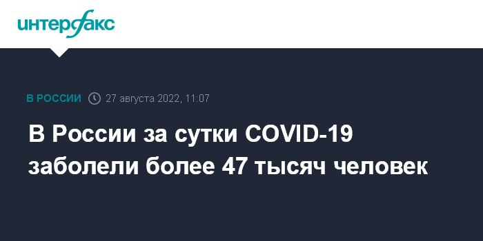 "По состоянию на 27 августа в РФ выявлено 47 093 новых случая COVID-19. Количество госпитализаций за сутки составило 4 354 человека и увеличилось в сравнении с предшествующими сутками на 11,3%", - сообщили в оперштабе.