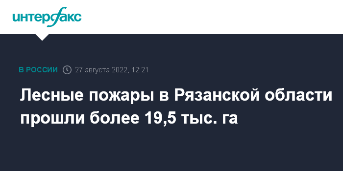 Москва. 27 августа. INTERFAX.RU - Общая площадь, пройденная лесными пожарами в Рязанской области, по состоянию на субботу выросла до 19,542 тыс. гектар, сообщается на сайте Авиалесоохраны.