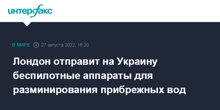 Москва. 27 августа. INTERFAX.RU - Великобритания передаст Украине шесть подводных беспилотников, которые планируется использовать для разминирования прибрежных вод Черного моря, информирует в субботу британское министерство обороны.
