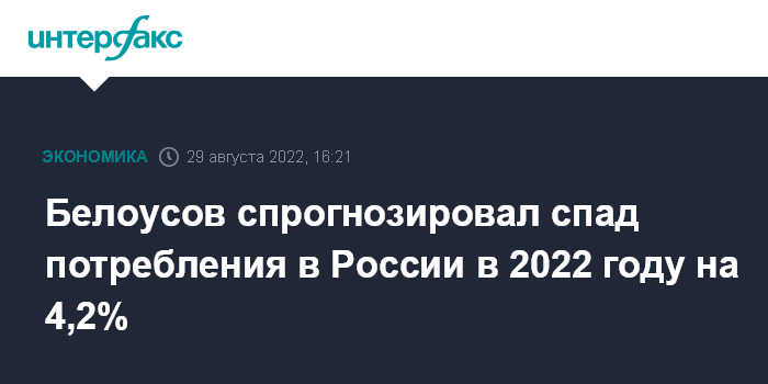 Москва. 29 августа. INTERFAX.RU - Спад потребления в России в 2022 году составит 4,2%, в 2023 году потребление вырастет на 2,5-3%, заявил первый вице-премьер Андрей Белоусов, ссылаясь на результаты анализа, который провело Минэкономразвития с участием Минфина, Банка России.