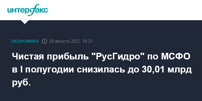 Москва. 29 августа. INTERFAX.RU - Чистая прибыль ПАО "РусГидро" по МСФО в I полугодии 2022 г. сократилась на 25,5% по сравнению с аналогичным периодом прошлого года, до 30,01 млрд руб., следует из отчета компании.