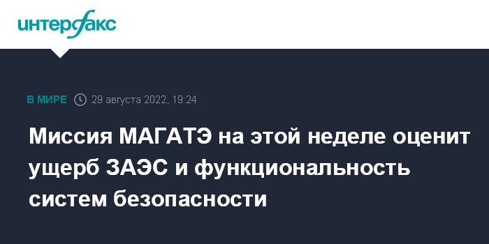 Москва. 29 августа. INTERFAX.RU - Делегация МАГАТЭ по прибытии на Запорожскую АЭС позднее на этой неделе оценит нанесенный объекту ущерб, характеристики систем безопасности, а также примет шаги для проверки использования ядерных материалов.