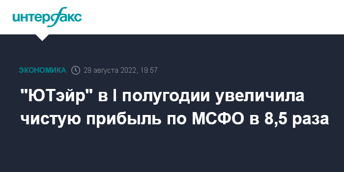Москва. 29 августа. INTERFAX.RU - Группа "ЮТэйр" в I полугодии 2022 года увеличила чистую прибыль по МСФО в 8,5 раза относительно результата этого же периода прошлого года, до 5,3 млрд руб., говорится в отчете группы.