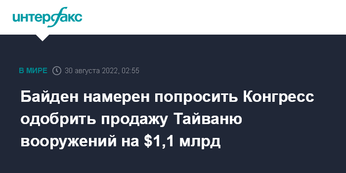 Москва. 30 августа. INTERFAX.RU - Администрация президента США Джо Байдена планирует официально запросить одобрение Конгресса на продажу Тайваню партии оружия на сумму около $1,1 млрд, сообщила газета Politico со ссылкой на информированные источники.