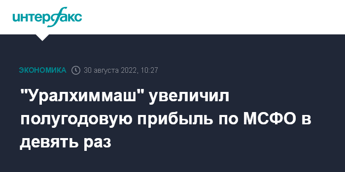 Москва. 30 августа. INTERFAX.RU - Группа "Уралхиммаш" в январе-июне 2022 года получила 622,68 млн рублей чистой прибыли по МСФО, что в 8,8 раза больше, чем за аналогичный период 2021 года, говорится в консолидированной отчетности компании.