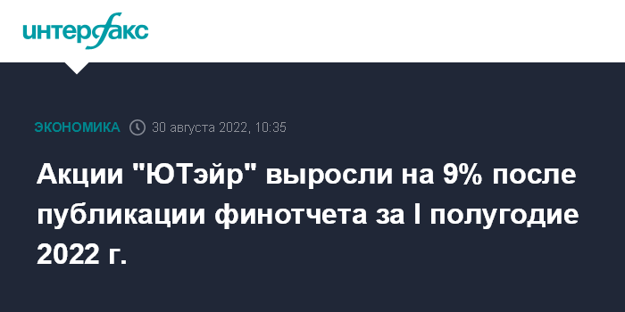 Москва. 30 августа. INTERFAX.RU - Акции "ЮТэйр" выросли в начале торгов на Московской бирже во вторник почти на 9% (до 9,86 рубля за штуку) после публикации финотчета за I полугодие 2022 года.