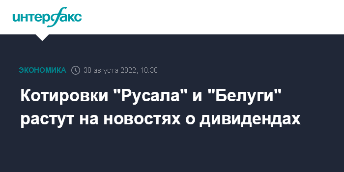 Москва. 30 августа. INTERFAX.RU - В начале торгов вторника на "Мосбирже" акции "Русала" подорожали на 3,7% (до 51 рубля за штуку), а ценные бумаги ПАО "Белуга Групп" - на 3,4% (до 2954 рубля за штуку) на новостях о рекомендациях советов директоров компаний выплатить дивиденды за I полугодие 2022 года.