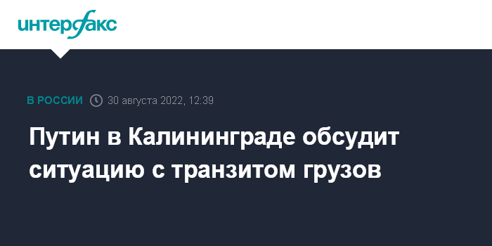 Москва. 30 августа. INTERFAX.RU - Президент РФ Владимир Путин в ходе поездки в Калининград обсудит ситуацию с транзитом грузов через Литву в этот российский регион, сообщил журналистам пресс-секретарь главы государства Дмитрий Песков.