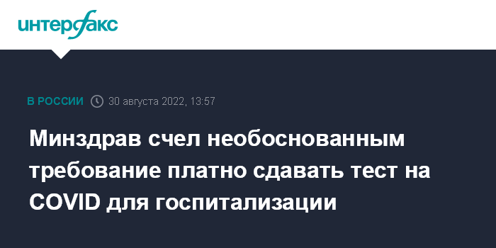 Москва. 30 августа. INTERFAX.RU - Требование платно сдавать ПЦР-тест на коронавирус для плановой госпитализации необоснованно; пациенты вправе сделать это бесплатно в рамках обязательного медицинского страхования (ОМС), сообщили "Интерфаксу" в пресс-службе Минздрава России.