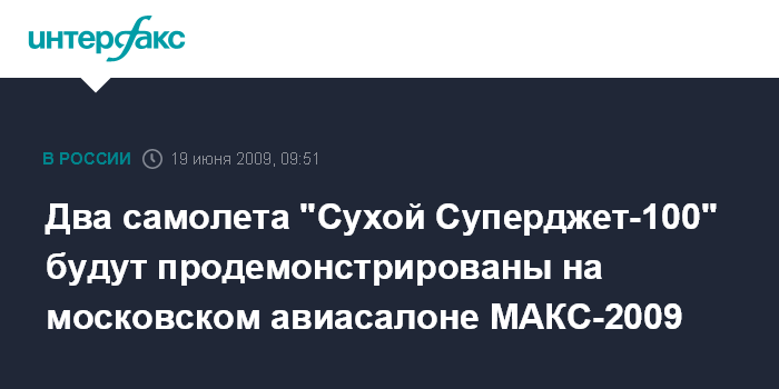 Москва. 19 июня. INTERFAX.RU - На авиационно-космическом салоне МАКС-2009, который пройдет в августе в подмосковном Жуковском, будут демонстрироваться два самолета "Сухой Суперджет 100", сообщил "Интерфаксу-АВН" глава компании "Гражданские самолеты Сухого" (ГСС) Виктор Субботин.