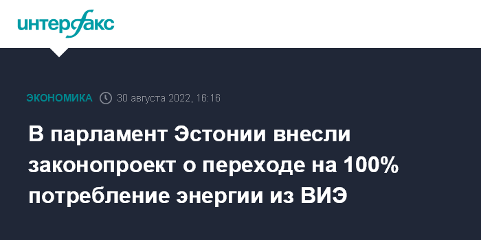 Москва. 30 августа. INTERFAX.RU - Комиссия по экономике парламента Эстонии (Рийгикогу) одобрила законопроект об организации энергетического хозяйства о полном переходе страны на возобновляемую энергию к 2030 году. Об этом сообщила пресс-служба парламента.