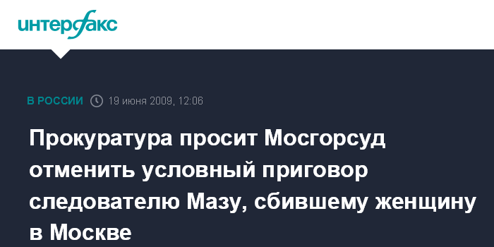 Прокуратура просит Мосгорсуд отменить условный приговор следователю Мазу, сбившему женщину в Москве