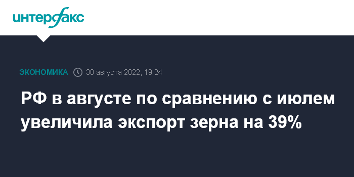 Москва. 30 августа. INTERFAX.RU - РФ в августе экспортировала за пределы ЕАЭС 3,7 млн тонн зерна, что на 39% больше, чем в июле (2,662 млн тонн), сообщает компания "ПроЗерно".