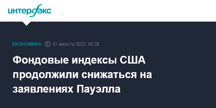 Москва. 31 августа. INTERFAX.RU - Фондовые индексы США завершили торги во вторник снижением, продолжив опускаться на заявлениях председателя Федеральной резервной системы (ФРС) Джерома Пауэлла.