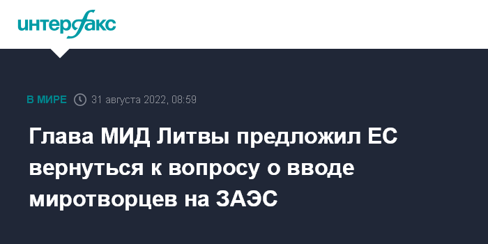 Москва. 31 августа. INTERFAX.RU - Министр иностранных дел Литвы Габриэлюс Ландсбергис предложил Евросоюзу вернуться к рассмотрению вопроса о введении военной миротворческой миссии для защиты Запорожской АЭС в Украине.