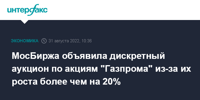 Москва. 31 августа. INTERFAX.RU - Московская биржа с 10:19 до 10:49 по Москве объявила дискретный аукцион по акциям "Газпрома" из-за роста их цены более чем на 20%, говорится в сообщении биржи.