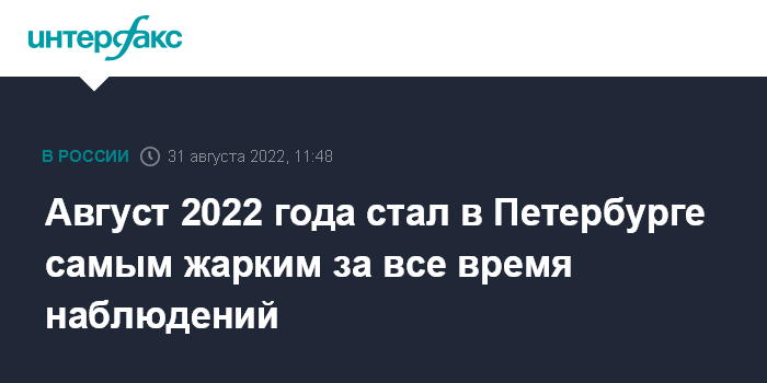 "Средняя температура воздуха в августе составила плюс 20,7 градуса, аномалия – плюс 3,3 градуса от нормы (норма для августа 17,4 градуса). (...) Август получается самым жарким: такая среднемесячная температура в Петербурге не регистрировалась с 1881 года (инструментальную историю наблюдений за погодой в Петербурге ведут с 1881 года - ИФ)", - сказал синоптик в среду на пресс-конференции в "Интерфаксе".