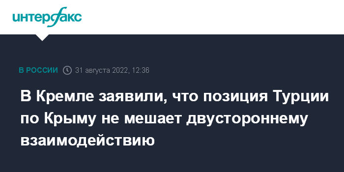 Москва. 31 августа. INTERFAX.RU - Риторика Турции по вопросу принадлежности Крыма не мешает двустороннему сотрудничеству, которое имеет большой потенциал, заявил пресс-секретарь президента РФ Дмитрий Песков.