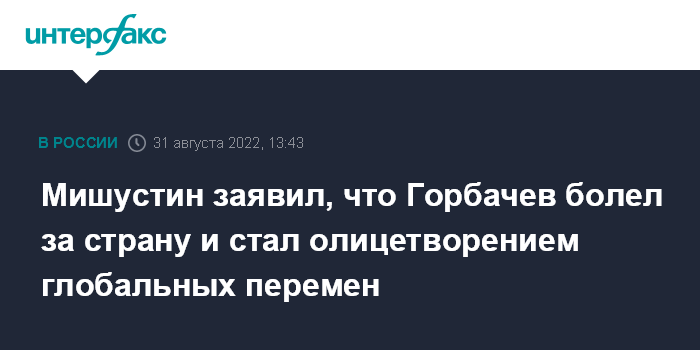 Москва. 31 августа. INTERFAX.RU - Экс-президент СССР Михаил Горбачев стал олицетворением глобальных перемен, произошедших в России и в мире, считает премьер РФ Михаил Мишустин.