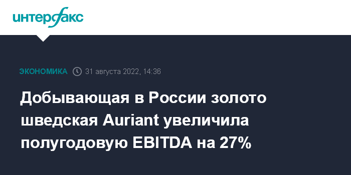 Москва. 31 августа. INTERFAX.RU - Шведская Auriant Mining, которая добывает в России золото, по итогам I полугодия 2022 года получила $13,5 млн EBITDA, это на 27% больше, чем годом ранее, сообщила компания.