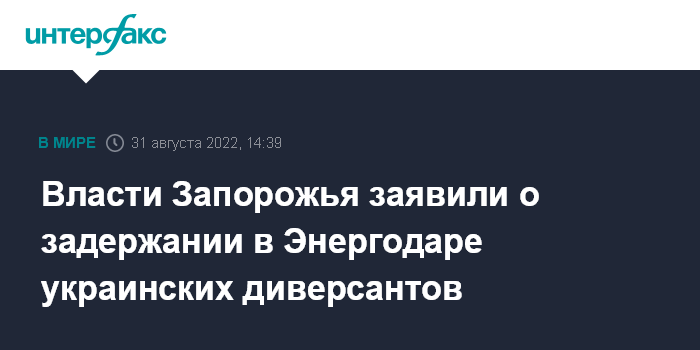 Москва. 31 августа. INTERFAX.RU - Во временной администрации подконтрольной РФ территории Запорожской области заявили, что российские правоохранительные органы задержали в Энергодаре группу украинских диверсантов.