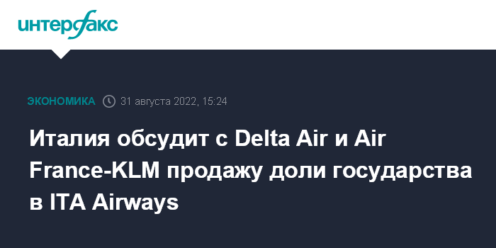 Москва. 31 августа. INTERFAX.RU - Итальянское правительство начнет переговоры о продаже принадлежащего государству контрольного пакета акций в авиакомпании ITA Airways (бывшая Alitalia) с американской Delta Air Lines Inc. и франко-голландской Air France-KLM. Об этом сообщил Минфин страны.