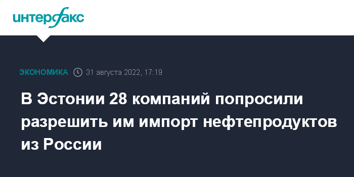 Москва. 31 августа. INTERFAX.RU - В Эстонии 28 компаний попросили власти страны разрешить им продолжить импорт российских нефтепродуктов в течение переходного периода после вступления в силу соответствующих санкций Евросоюза против России.